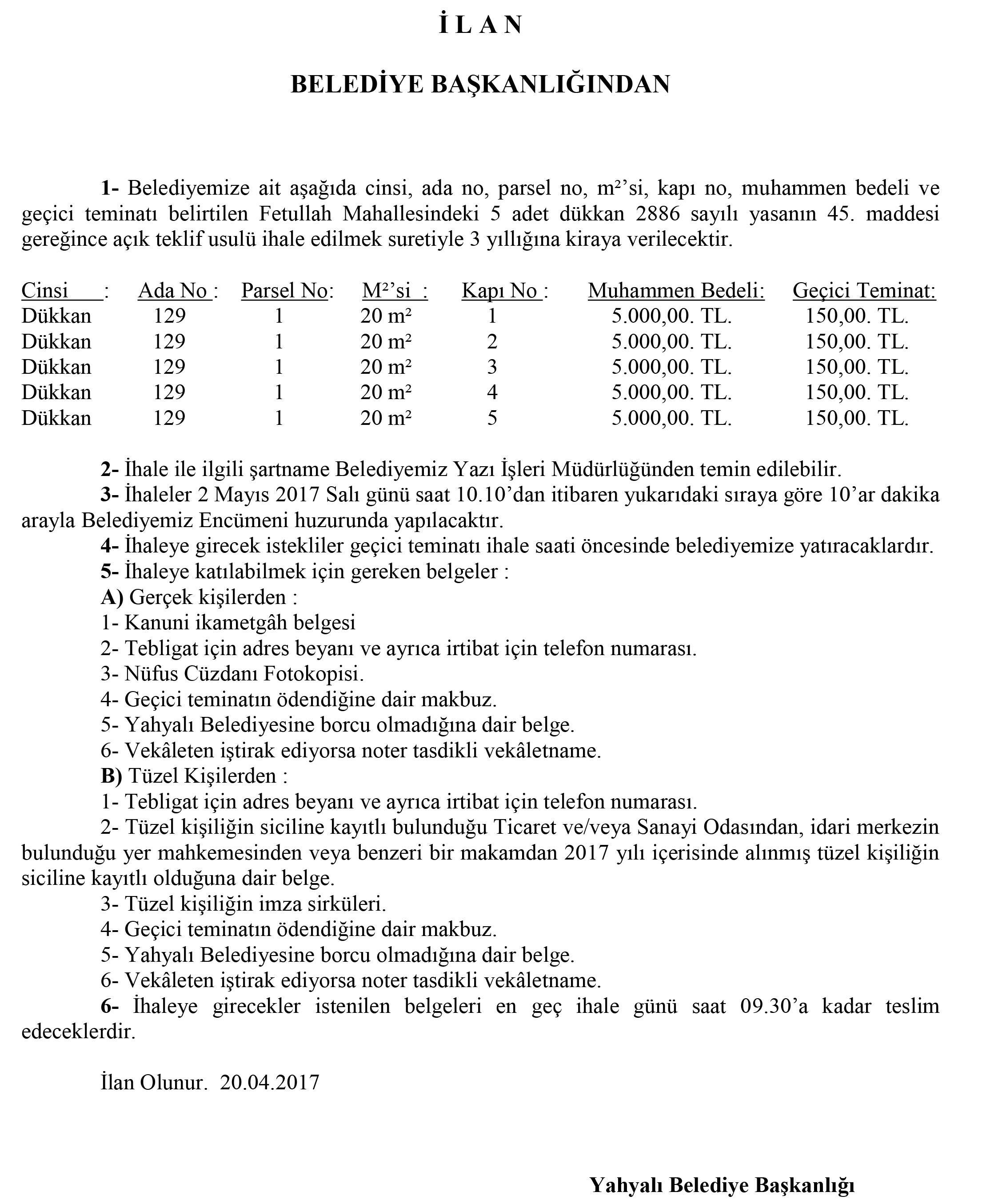 FETULLAH MAH. 5 ADET DÜKKANIN KİRAYA İHALE İLANI